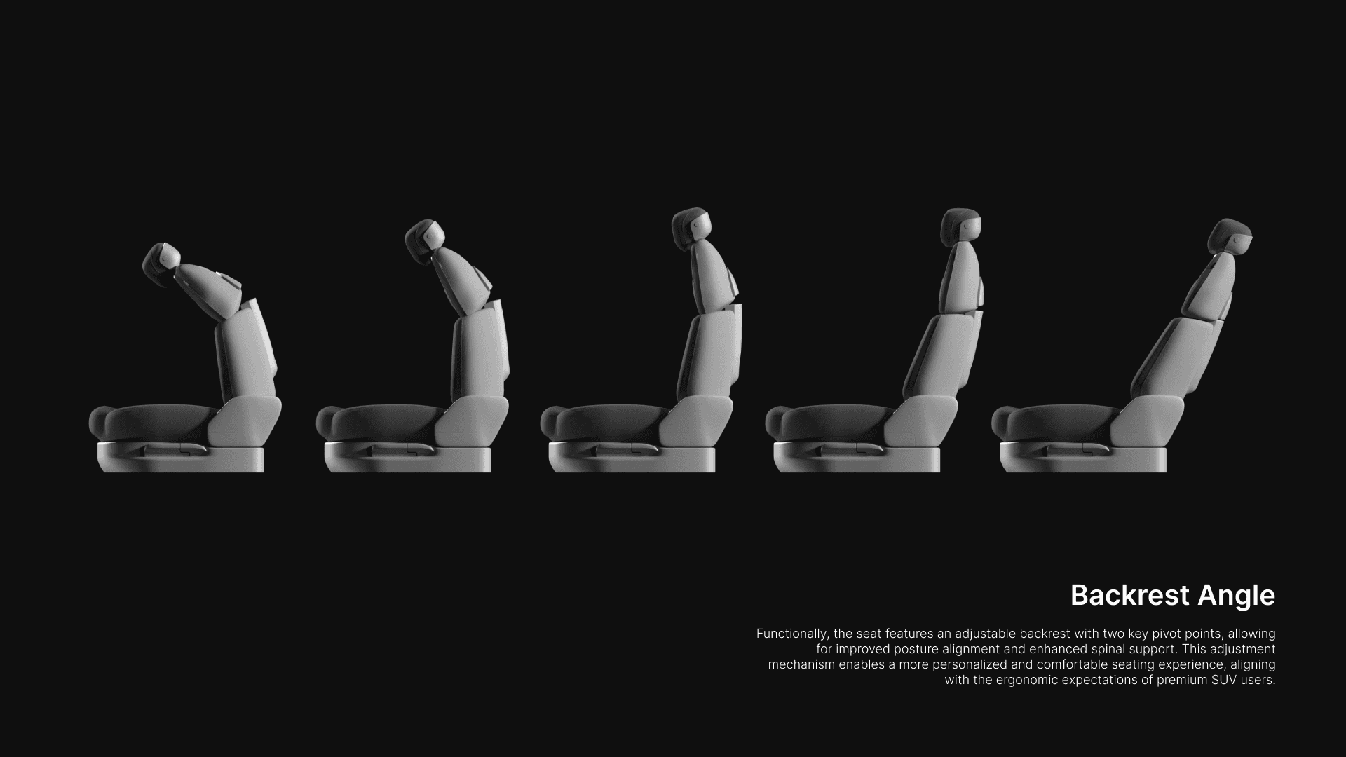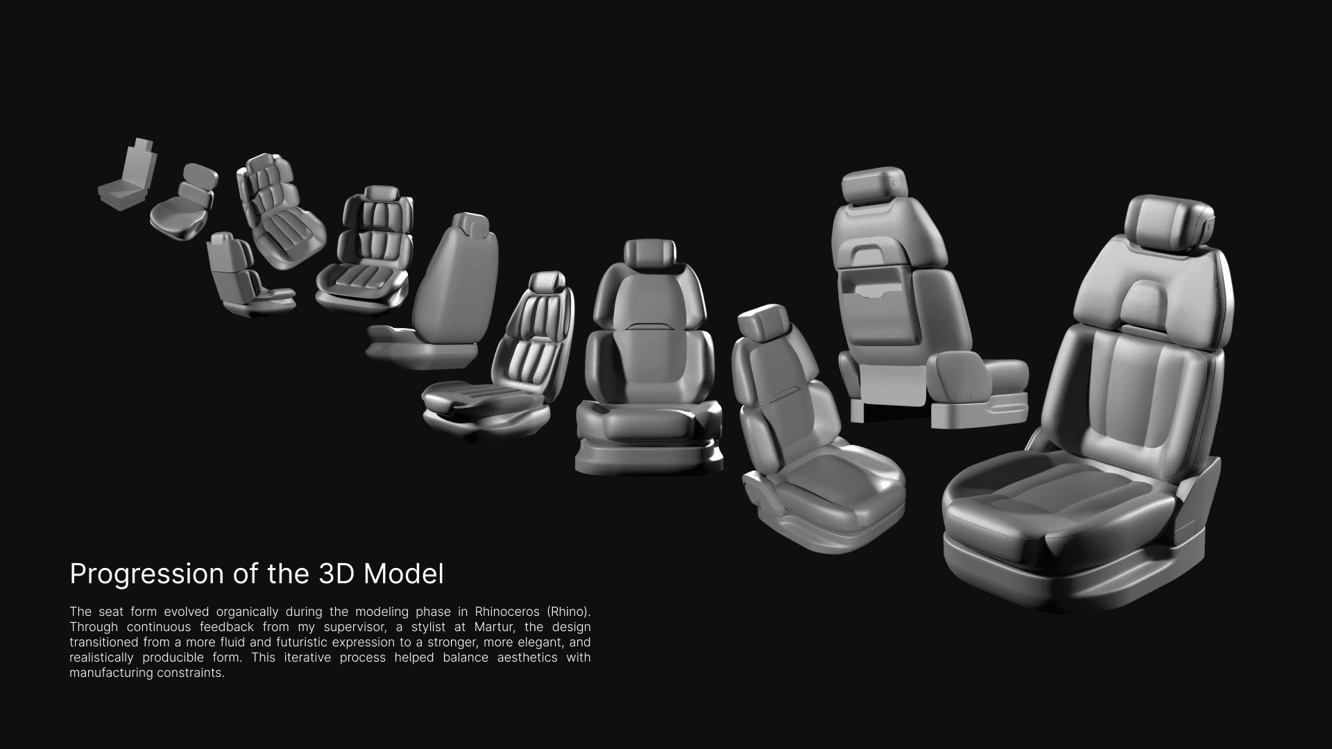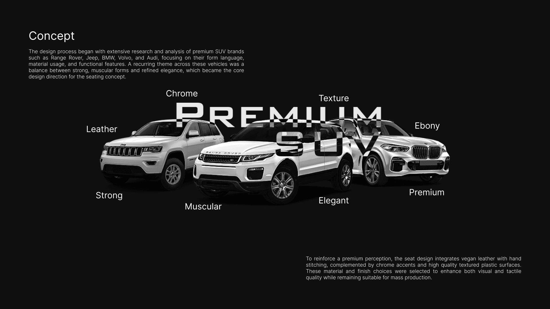 This internship project focuses on creating a premium, upper-segment seating concept for SUV vehicles. Developed at Martur, a global automotive seating manufacturer, the design explores how strength and elegance can be translated into seat form, materials, and functionality. Inspired by brands such as Range Rover, BMW, Volvo, Audi, and Jeep, the seat combines muscular yet refined forms with premium material choices. Vegan leather with hand stitching, chrome details, and high quality textured plastic surfaces were selected to enhance both visual and tactile quality while maintaining producibility.